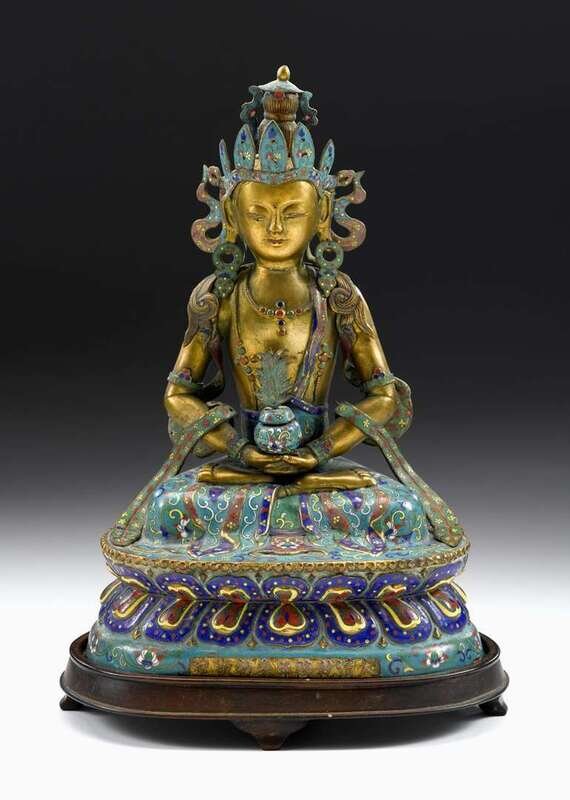 Large and impressive Chinese gilt bronze and cloisonne enamel Amitayus qianlong mark, qing dynasty