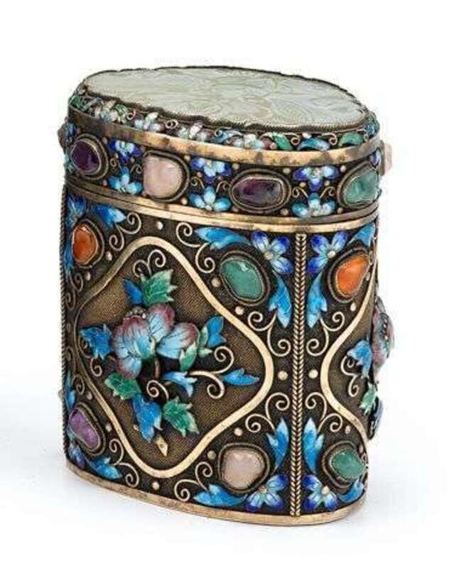Chinese silver enameled jade and semi-precious stone mounted box late 19th century