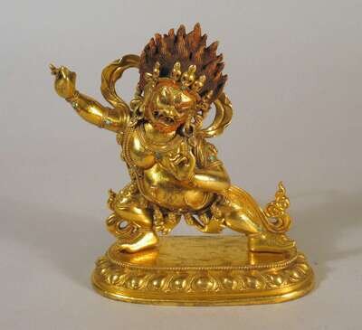 Well cast pigment to flame like hair and skull crown, ribbon halo to shoulders revealing open chest and standing wide legged over lotus thrown.