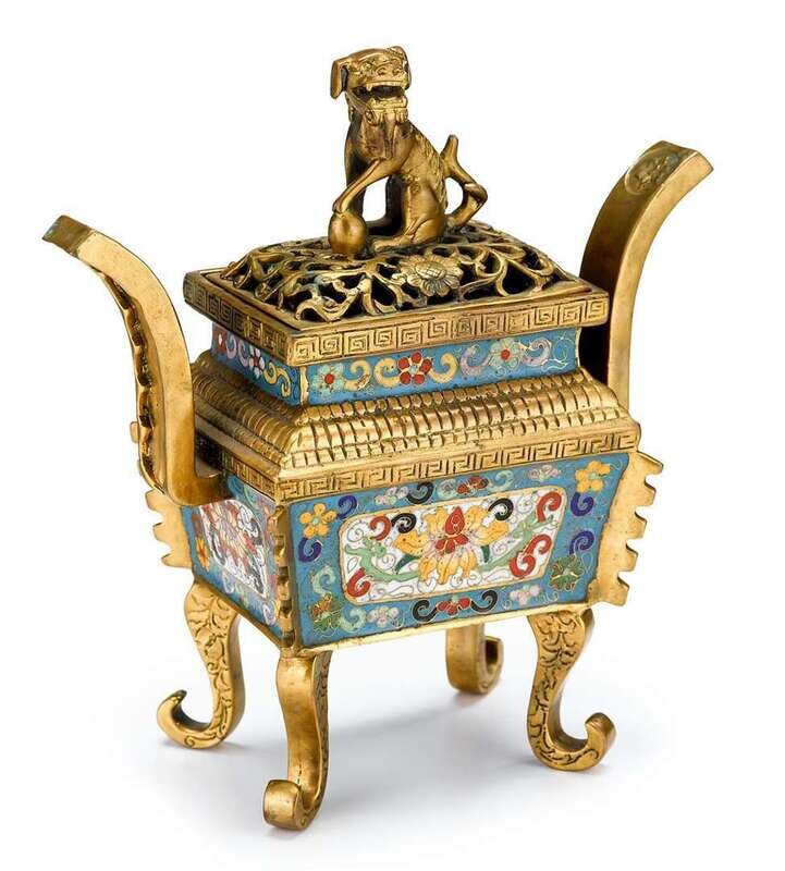 Of archaic tapering, rectangular form with scroll feet; the openwork bronze lid surmounted by fu lion finial.