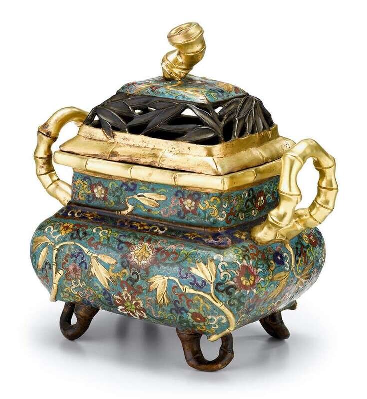 Of rounded rectangular form with openwork lid; brightly enameled and accentuated by gilt-bronze bamboo-form handles, rim, feet and finial.