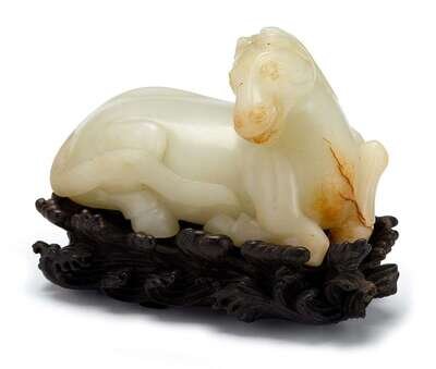 Recumbent figure with long, well-textured tail and mane looks aside with wide-eyed, open-mouthed expression; jade of slightly-green hue with few russet inclusions; with well-carved wooden stand.