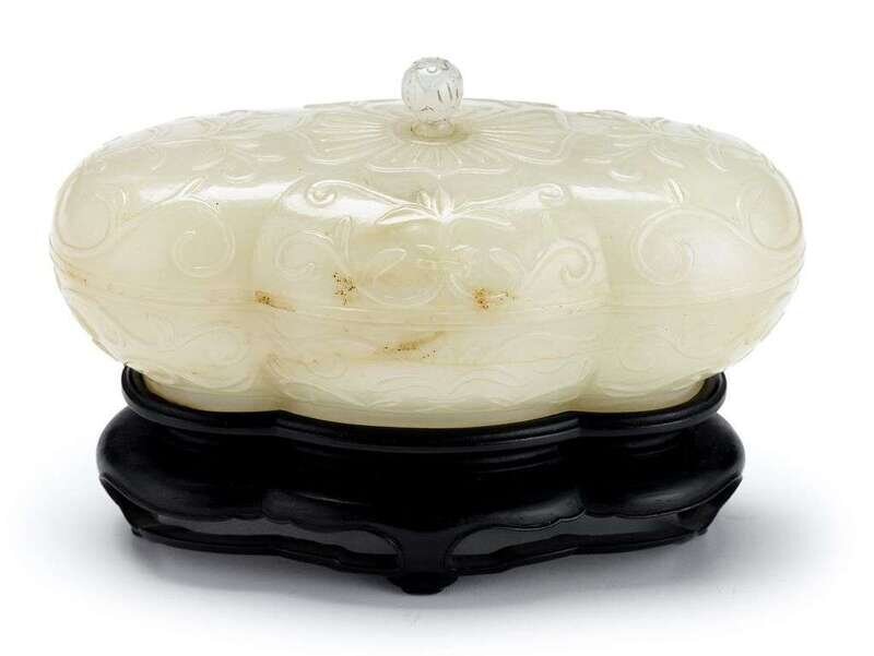 Of rounded, lobed form; carved in the mughal style with scrolling foliate relief decoration and lotus-form top and finial.