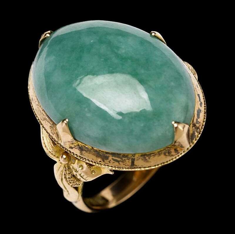Oval cabochon green jadeite stone set to foliate cast band.