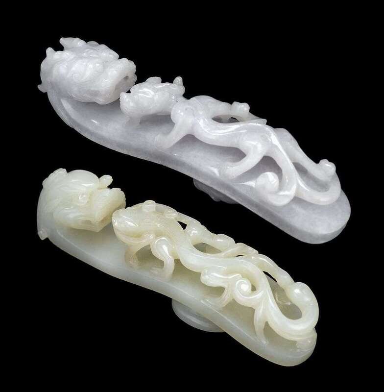 Larger piece of cloudy white hue with dragon-head hook and full-length chimera carved to body; smaller piece of celadon hue with similar form.