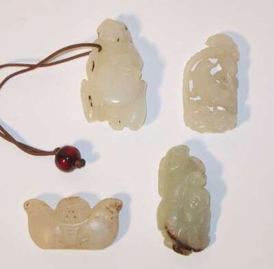 Comprising a well-carved openwork grouping of two songbirds on a stump and among lingzhi; a slightly-celadon grouping of two boys with lingzhi; a carved boy with drum and lotus pad and an unusual figural pendant of obscure design (4).