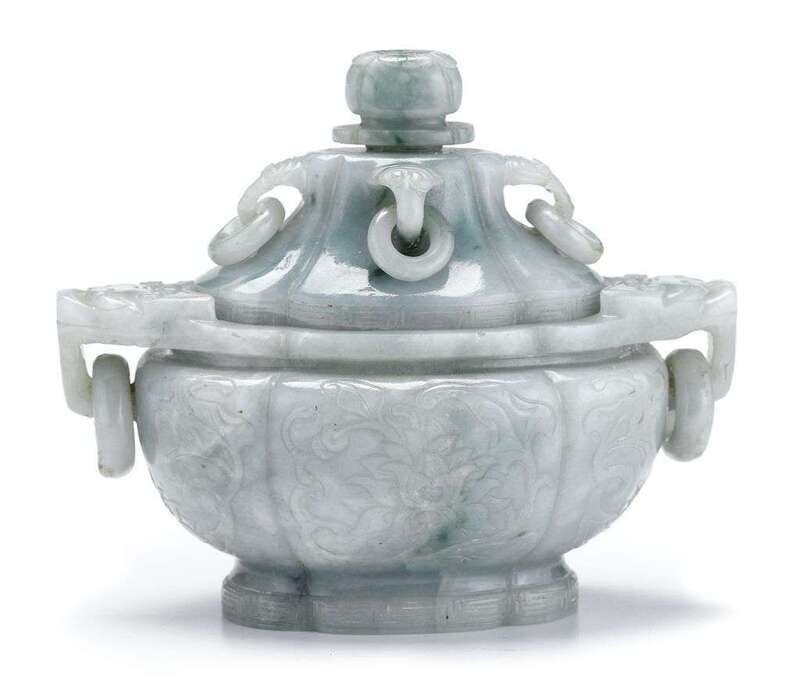 Of flattened, oval form with two mask and ring handles to lobed and relief-carved body; lid with four ring handles and lotus finial.