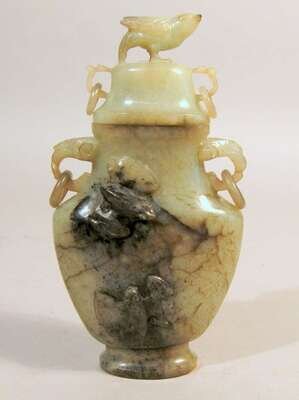 The bird-carved finial surmounts a domed cover, of baluster form with ring handles and a carved base; bats carved to the body in medium relief.