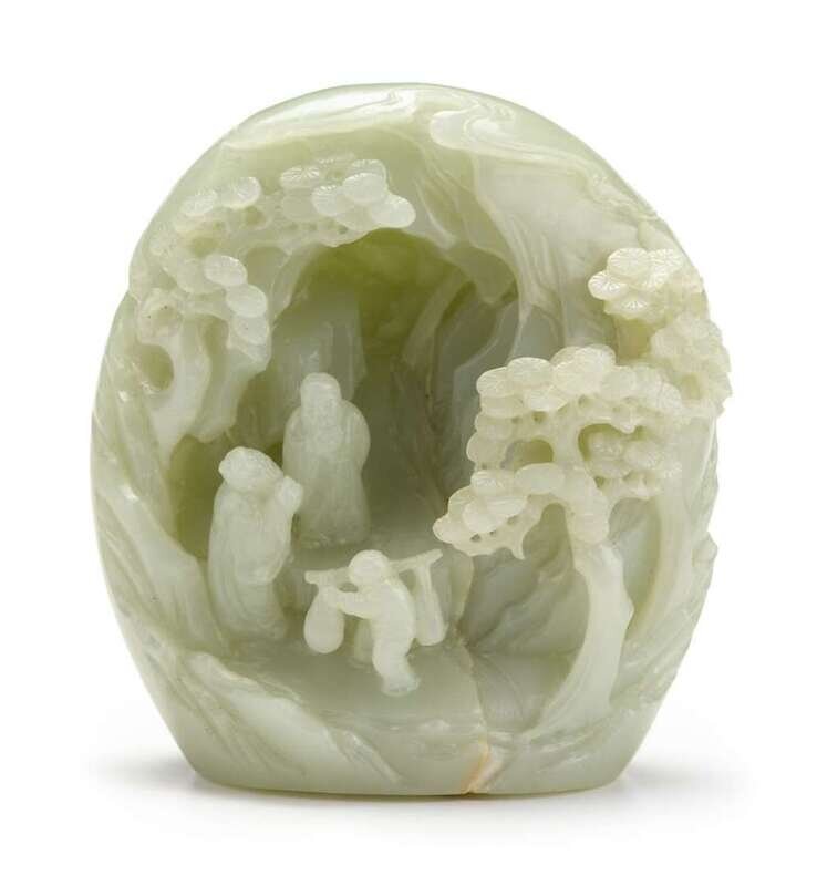 Of boulder form, carved grotto enclosing immortal and framing pine trees.