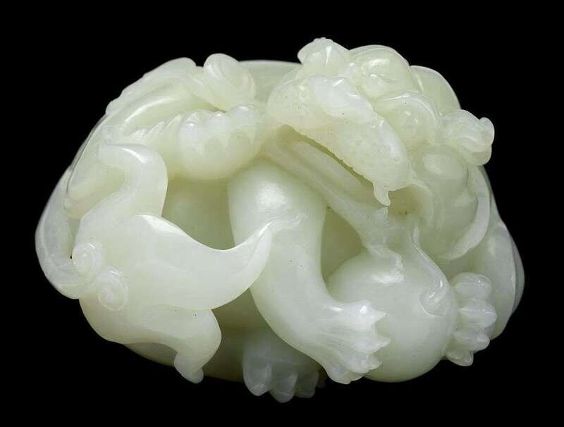 Single section carving, worked to show coiled Fu lion grasping a ball, detailed face and flame carved tail.