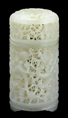 Of cylindrical form, pierced and reticulated to show dragon and lotus scrolls, cover over matched base raised on three bracket feet.