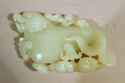 Of single section carving, worked to show mythical beast surmounted by monkey issuing flaming scrolls.