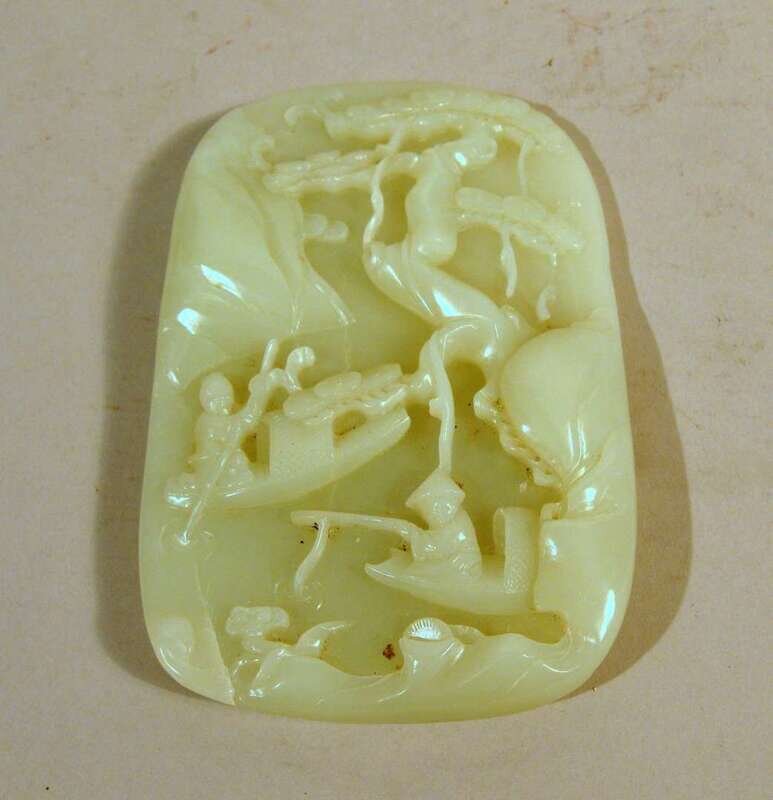 Of tall rectangular form, carved in medium relief to show scholar in sampan amongst river landscape.