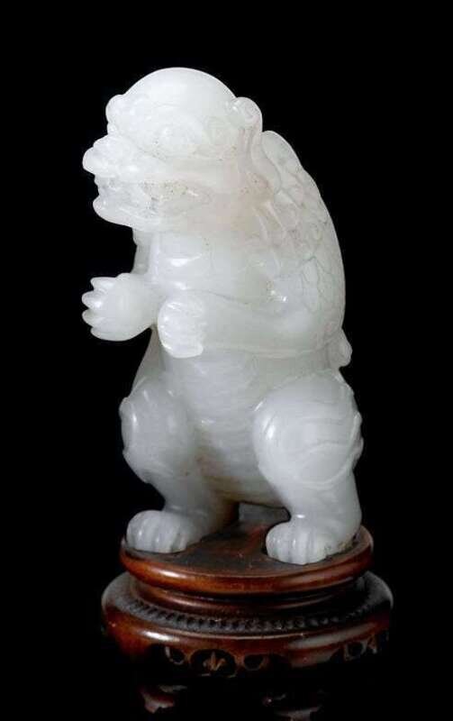 In the form of a mythological pixiu sitting up on its haunches, its winged body resembling a dragon-like lion and its head resembling a dog-like lion; with wooden stand.