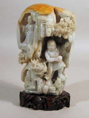 Of tall oval form, brownish pebble skin to surface top, well reticulated and carved to show five well-detailed figures recessed among a mountainous landscape, wood stand.