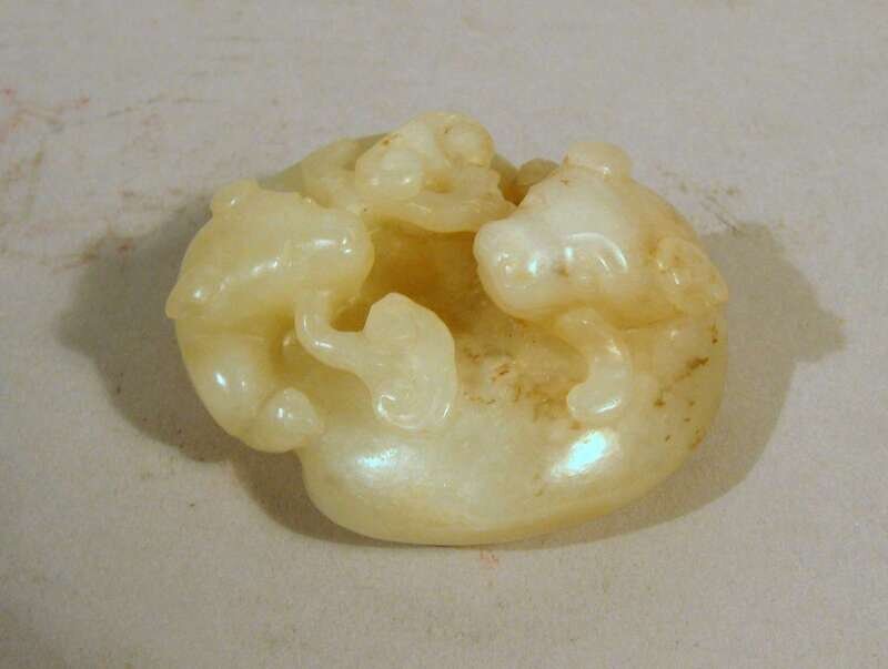 Of rounded, pebble-like form depicting two intertwined foxes holding lingzhi in their mouths.