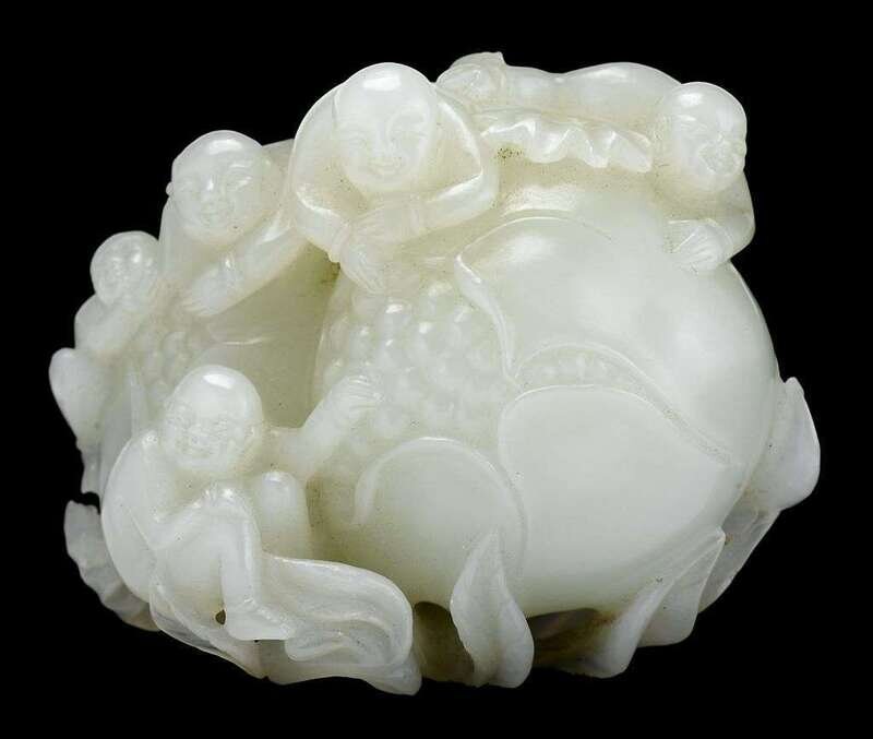 Depicting pair of pomegranates with openwork leafy stems being climbed upon by four bald, imp-like figures; jade of slightly green hue.
