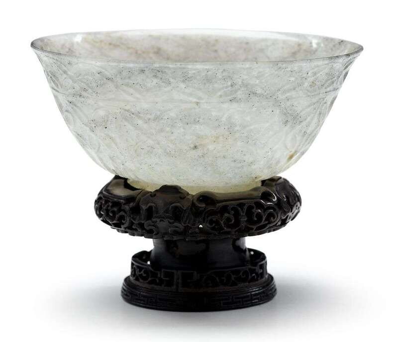 Carved with rounded sides well-incised in medium relief to show geometric bands enclosing foliate blossoms, raised on a petal form foot, wood stand.