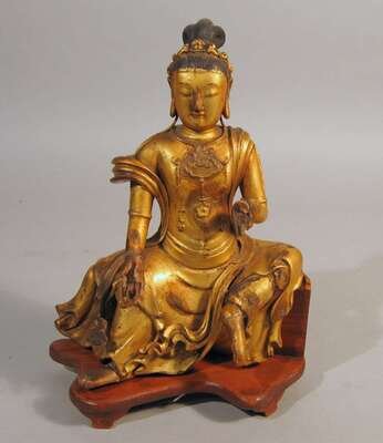 Depicting the goddess in a seated position with one leg raised and hands in vitarka mudra; with flowing robes left open at the chest to reveal talisman, with lacquered hair; on later wooden base.