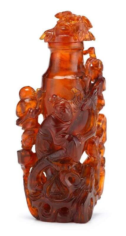 Single-piece openwork carving depicts tall covered vase supported by two figures and leafy tendrils; with carved wooden base.