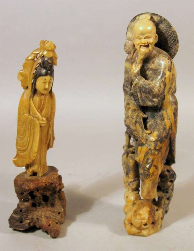 Tallest figure of mottled dark and olive color, depicting joyous elderly man with freshly-caught fish; the second, two-piece carving depicts a Meiren in long robes bearing a large bloom and standing on a rocky outcrop; with ink embellishments (2).