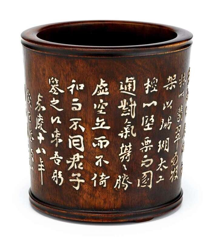 Large Chinese bone inlaid hardwood brush pot 19th century