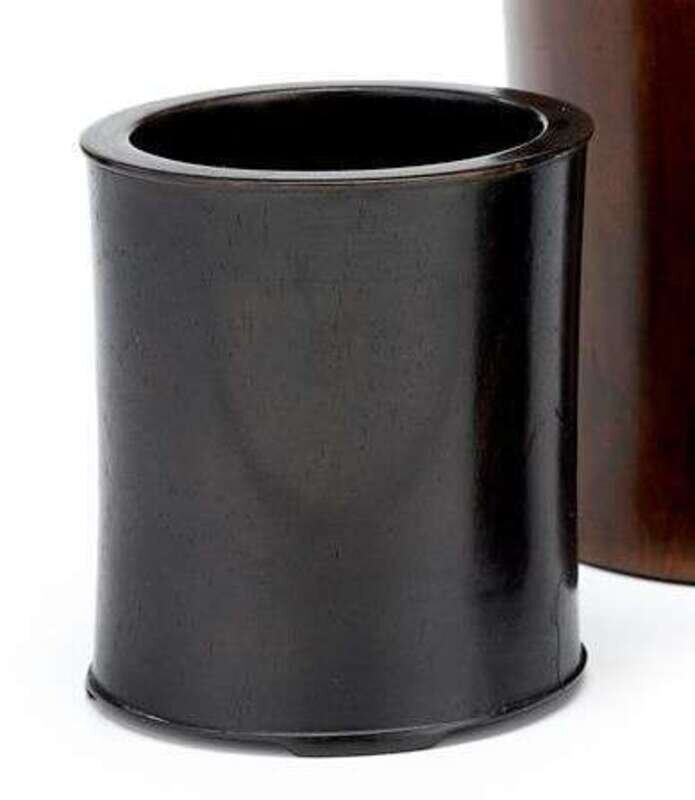 Of cylindrical form, beaded rim and foot rim, raised on bracket feet, missing plug, good tight grain.