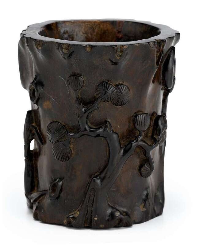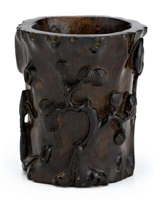 Of typical cylindrical form, carved in detail and high relief to show pine trees, fu bats and bamboo groves, good hollowed interior, later plug to base.