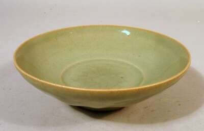 Of rounded form, incised base, outer wall well carved to show lotus leaves raised on a circular foot, unglazed foot.