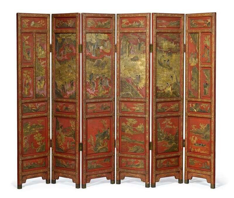 Fine Chinese incised and gilded red dry-lacquer six panel screen jiaqing period