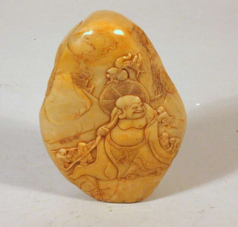 Of tall boulder form, carved in medium relief to show Budai and attendants, peach verso.