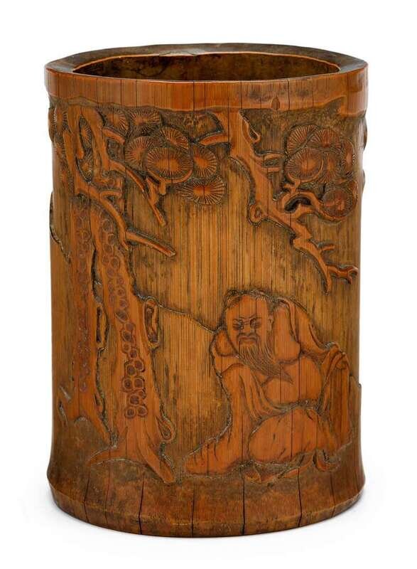 Of tall cylindrical form, carved in high relief to show immortal framed by scrolling clouds and pine tree, good honey hue.
