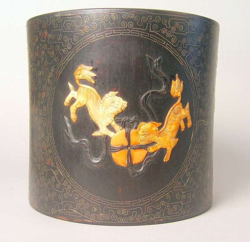 Of tall and wide cylindrical form, inlaid with white metal wire to show scrolls and Greek band enclosing Fu lions at play.