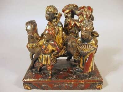 Chinese red lacquer and gilt-decorated stone figural grouping 19th / 20th century