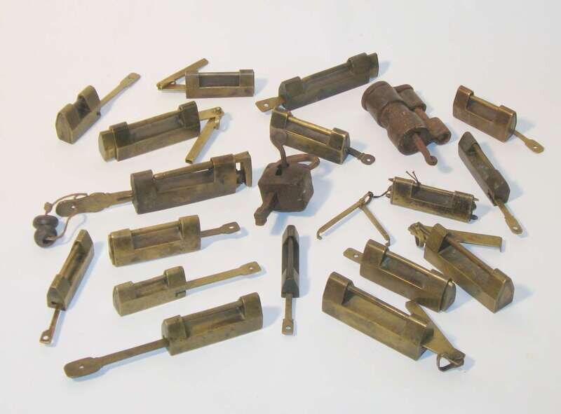 Mostly of rectangular form with brass hardware and keys; some of pure iron and only one example without functioning key.