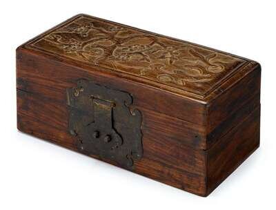 Of rectangular form; lid carved in relief to depict blooming prunus bough; with decorative metal lock plate and clasp.