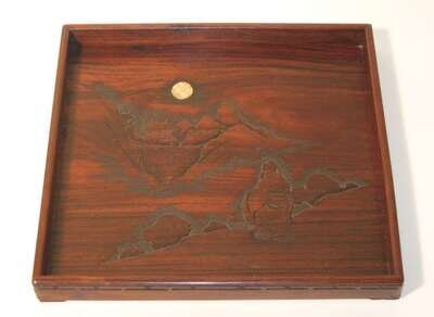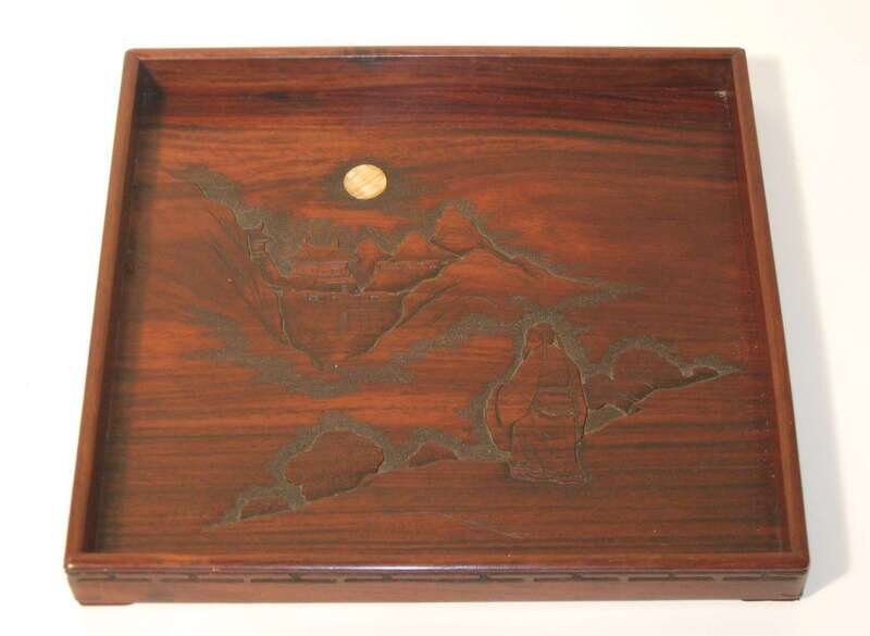 Of shallow square form; interior carved in light relief to depict a mandarin gazing at a distant palace below an inset mother-of-pearl moon; exterior walls carved with a fret band; raised on slight bracket feet.