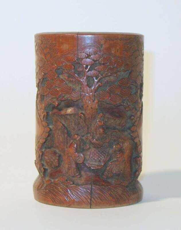 Of small cylindrical form; carved in deep relief to show three elderly men gathered around a game board under large pine tree.
