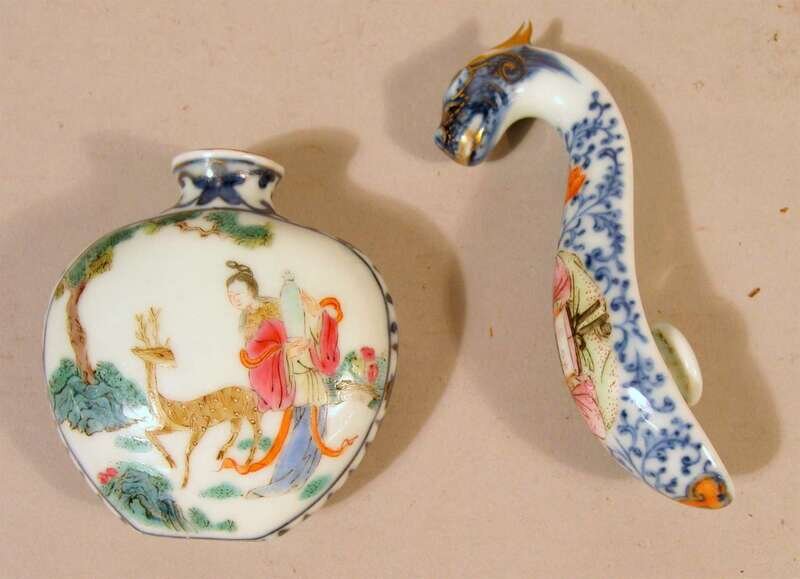 Chinese famille rose porcelain garment hook and snuff bottle both with qianlong marks, 20th century