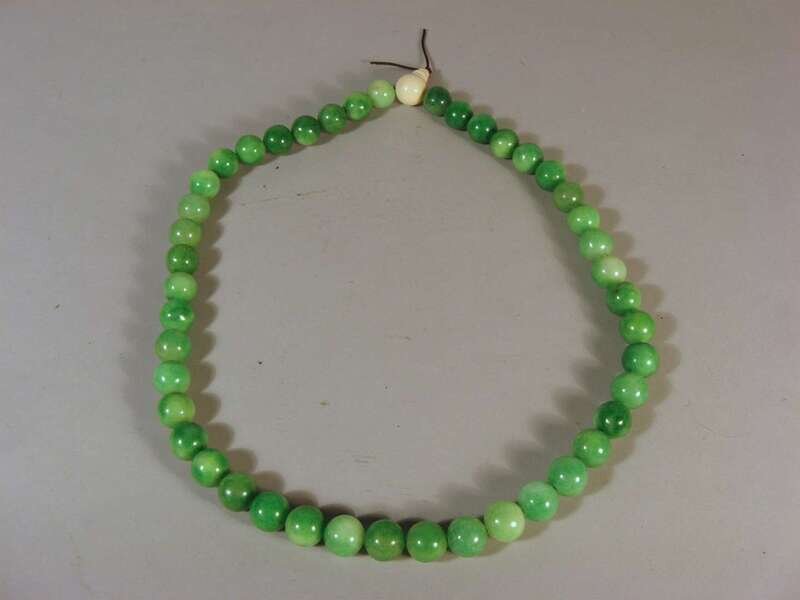 Comprised of forty-four green jadeite beads and single ivory clasp.