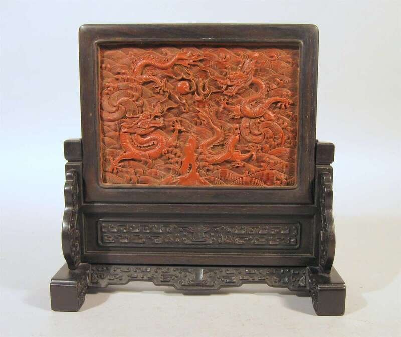 Of rectangular form; insert panel carved in relief to depict dragons pursuing flaming pearl; hardwood stand of typical form, carved in archaic decorative motif.