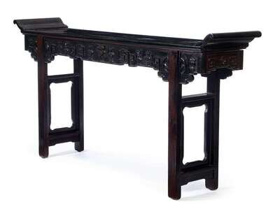 The rectangular top, set with shaped flanges over wide and high apron, carved to show various antiques, raised on straight joined legs.