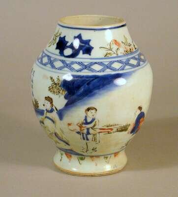 Of altered baluster form, depicting imperial figural study between lotus and diamond bands; floral collar.