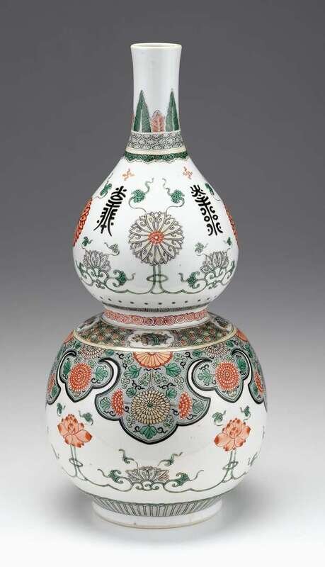Of double gourd form, lappet band to slender neck, over enameled Shou symbols and detailed Indian lotus blossoms, waisted body, bottom with geometric collar over lingzhi and chrysanthemum band, Lotus and vine to base, raised on white glazed circular foot.