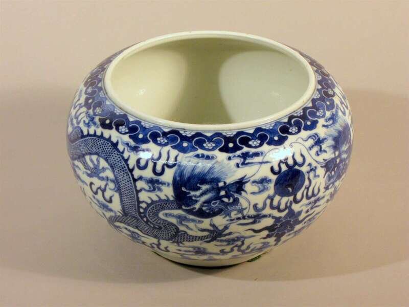 Of wide cylindrical form, well painted in cobalt blue to show dragon among flaming pearls of wisdom, celestial sea to circular foot.
