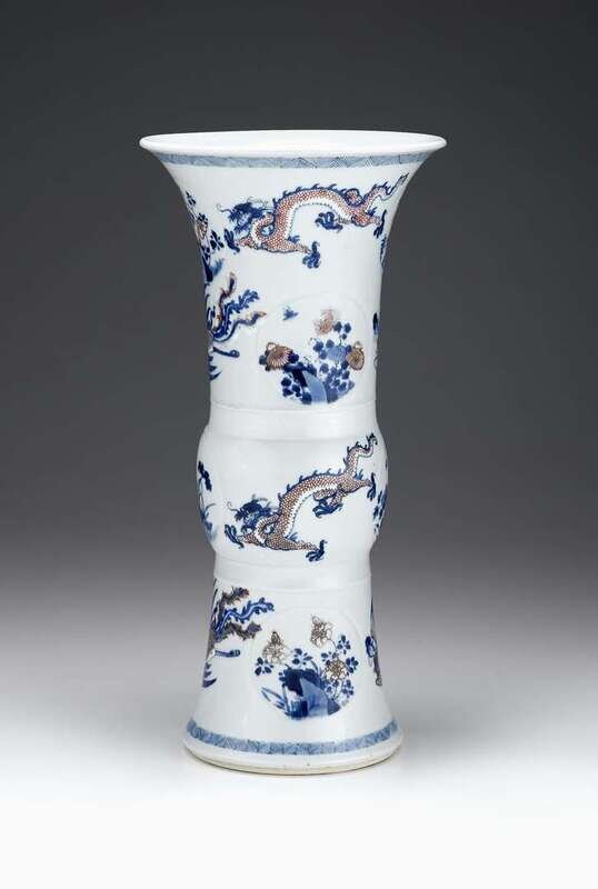 Important Chinese copper, blue and white porcelain 'dragon and phoenix' beaker vase kangxi period