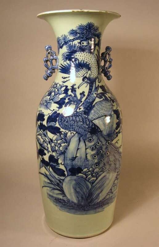 The largest a floor vase of twin-handled, ovoid form with a flared rim and applied prunus-form handles, vividly decorated in cobalt blue to depict peacocks in natural landscape, together with two smaller ovoid vases with flared rims and cobalt decoration showing figures in idyllic mountain village settings (3).