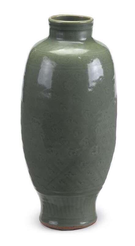 Of ovoid form with shallow-carved fluting to tapered base and neck and cross-hatch and cloud ground to body; buff, unglazed footring.
