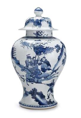 The domed cover surmounts a baluster base, painted to show boys at play and figural landscape.
