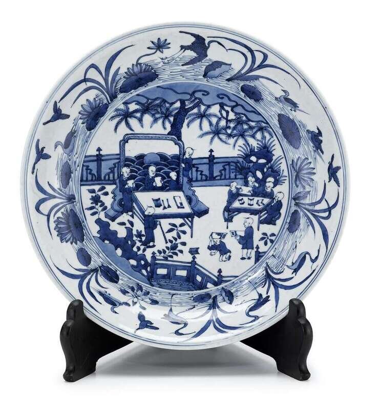 Of slightly rounded form, aquatic scape to rim, central cartouche of boys within court landscape, lingzhi band to outer wall, mark to glazed base.